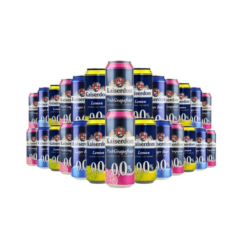 Enjoy Kaiserdom Alcohol Free 0.0% lagers with refreshing lemon, pink grapefruit flavors, 24 x 500ml case—perfect for alcohol-free refreshment.